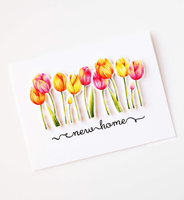 Stamps - Spring Tulips & Sweet Sentiments Plus / Dies - Spring Tulips Die Collection / Ink - VersaFine Onyx Black; Memento London Fog / Colouring Medium - FaberCastell Polychromos / Other - Inkadinkado Stamping Mask Paper